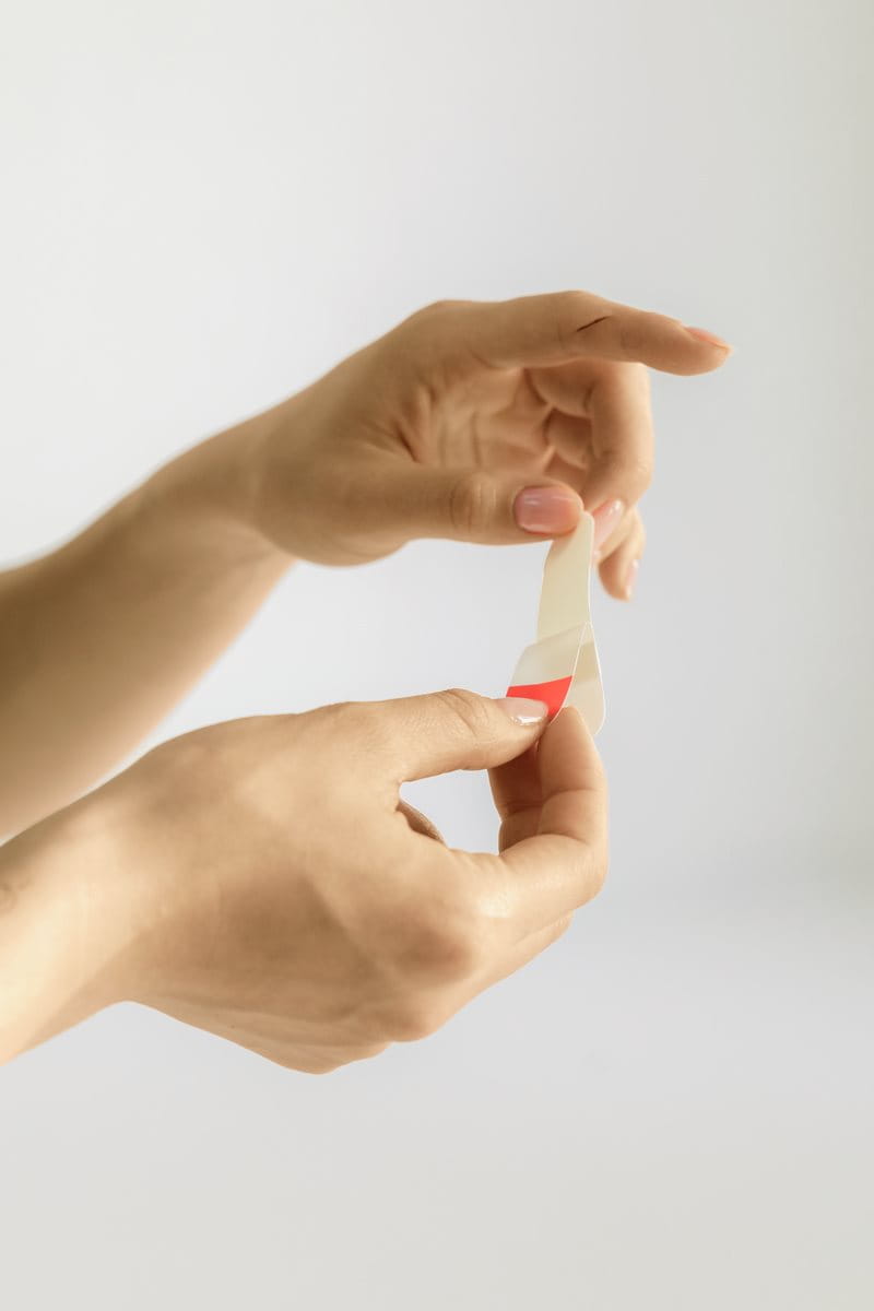 Carefully remove the white paper foil and apply the plaster directly on the wound without stretching the plaster – the whole plaster acts as a wound pad.